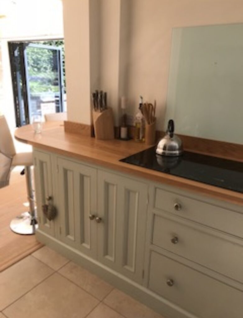 The kitchen layout itself worked well for the clients and didn’t need altering. However, after several years of use, the cabinetry and wooden worktops were showing their age. The paint had dulled, and the oak work surfaces had developed dark water stains around the sink and tap areas — a common issue in older wooden kitchen worksurfaces.