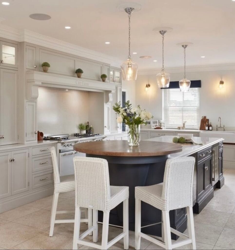 The colour scheme contrasts beautifully, with the main kitchen area painted which is painted in the equivalent colour to Little Greene’s French Grey, while the island and pantry were given a hand painted finish in the equivalent colour to Farrow & Ball’s Downpipe, this introduces a striking depth. This clever use of colour delineates the space, adding visual interest and warmth. The tall larder units conceal a hidden walkthrough pantry, also hand painted.
